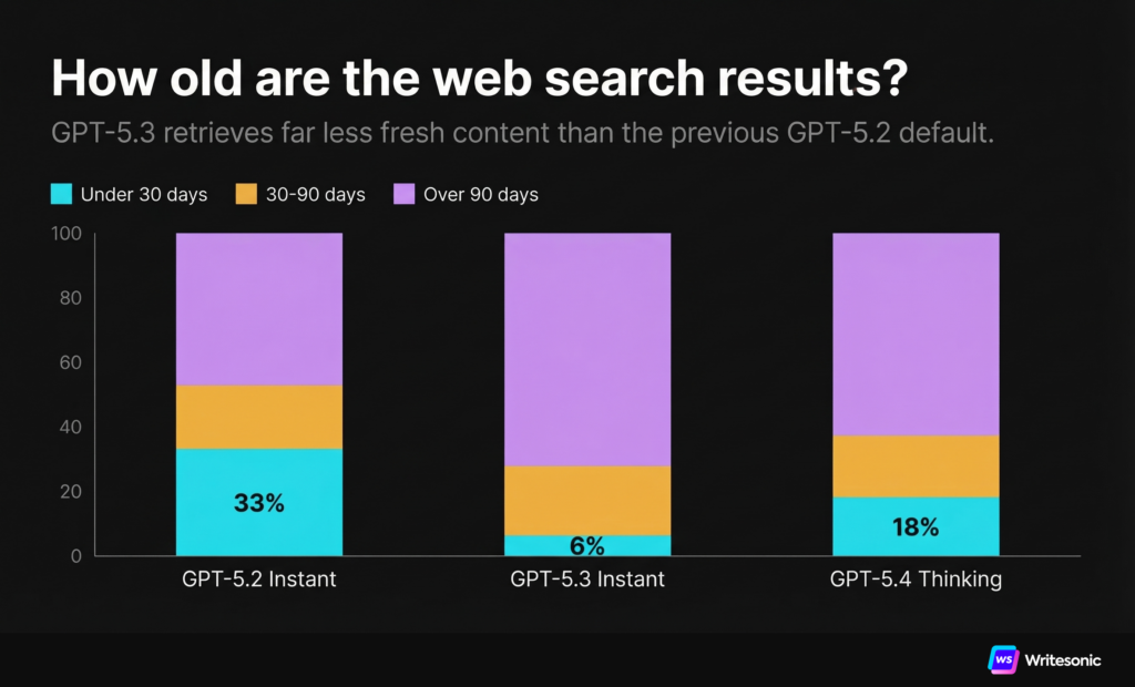 The GPT-5.2 to GPT-5.3 shift looks incremental on the surface. Same query count. Similar citations. But GPT-5.3 is worse for brands (8% vs 22% first-party), worse for freshness (6% vs 33% under 30 days), and more blog-dependent (32% of citations are blog posts).
