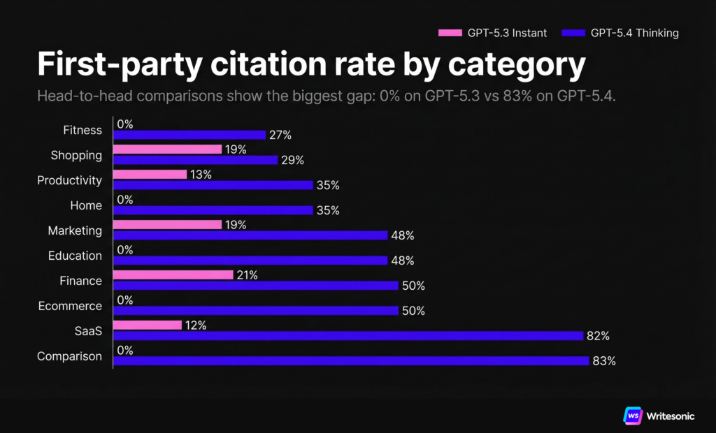 Head-to-head comparisons show the biggest gap: 0% on GPT-5.3 vs 83% on GPT-5.4. SaaS sees a 7x improvement (12% to 82%). Even shopping, where GPT-5.4 is least brand-forward, still doubles the first-party rate.