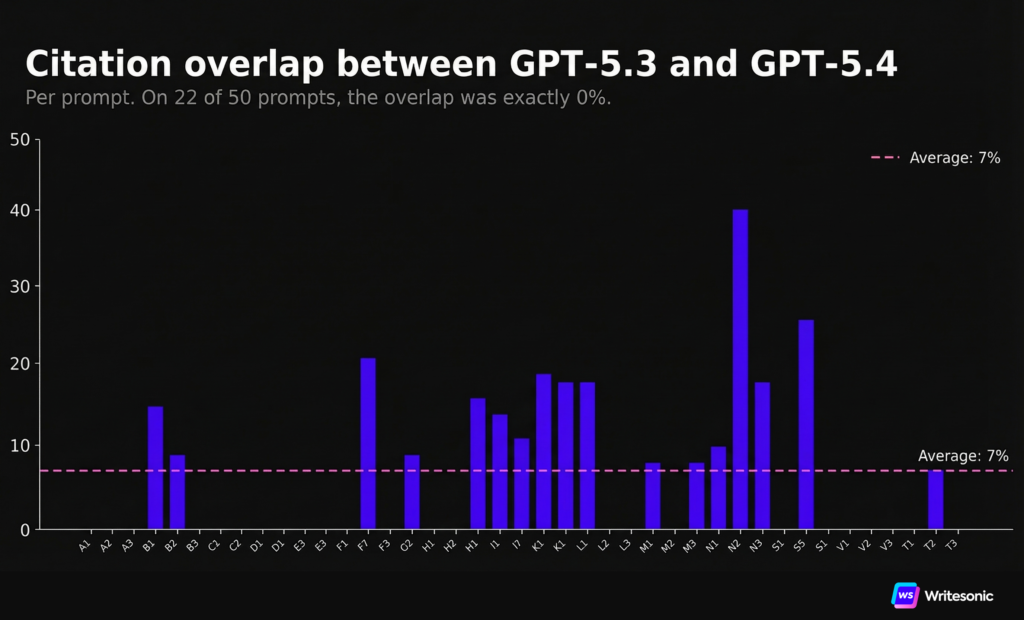 On 22 of 50 prompts, the overlap was exactly 0%. Being visible on GPT-5.3 gives you no advantage on GPT-5.4.