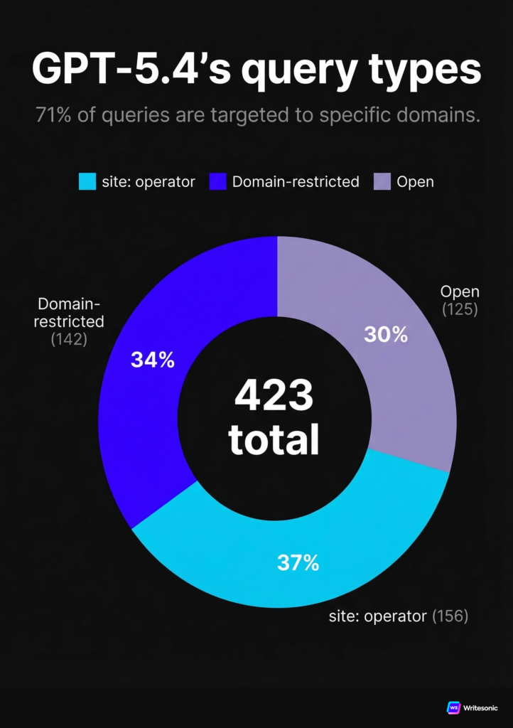 GPT-5.4 also uses two features no other model uses: domain-restricted queries (148 total) and site: operators (156 total). Combined, that’s 304 targeted queries across 50 prompts.