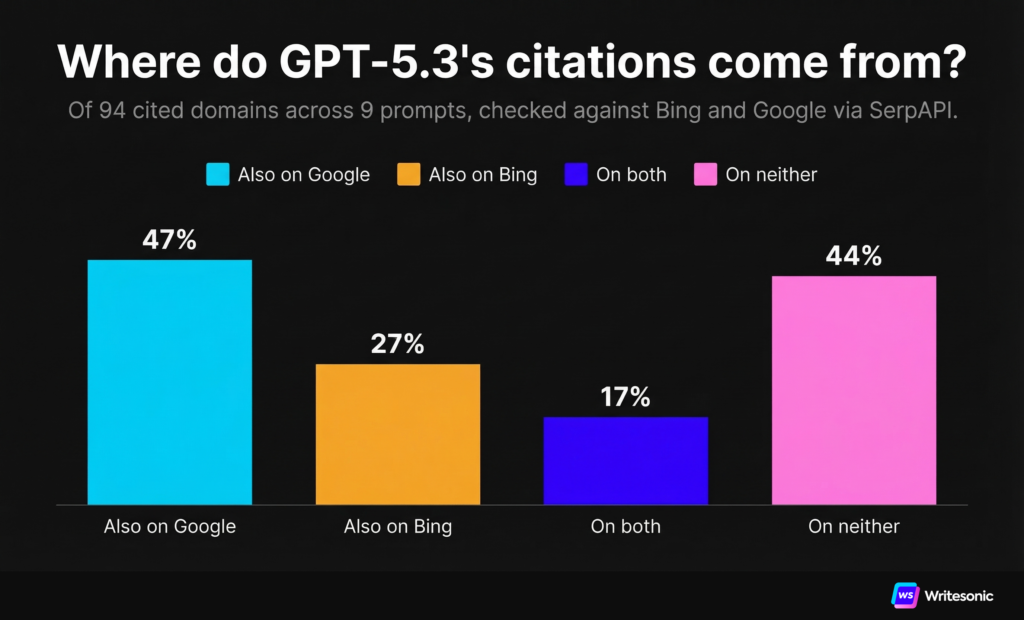 What's the 44% that appears on neither Google nor Bing? Nearly half of GPT-5.3's citations don't rank on either search engine for the same query. OpenAI has a retrieval mechanism beyond traditional search.