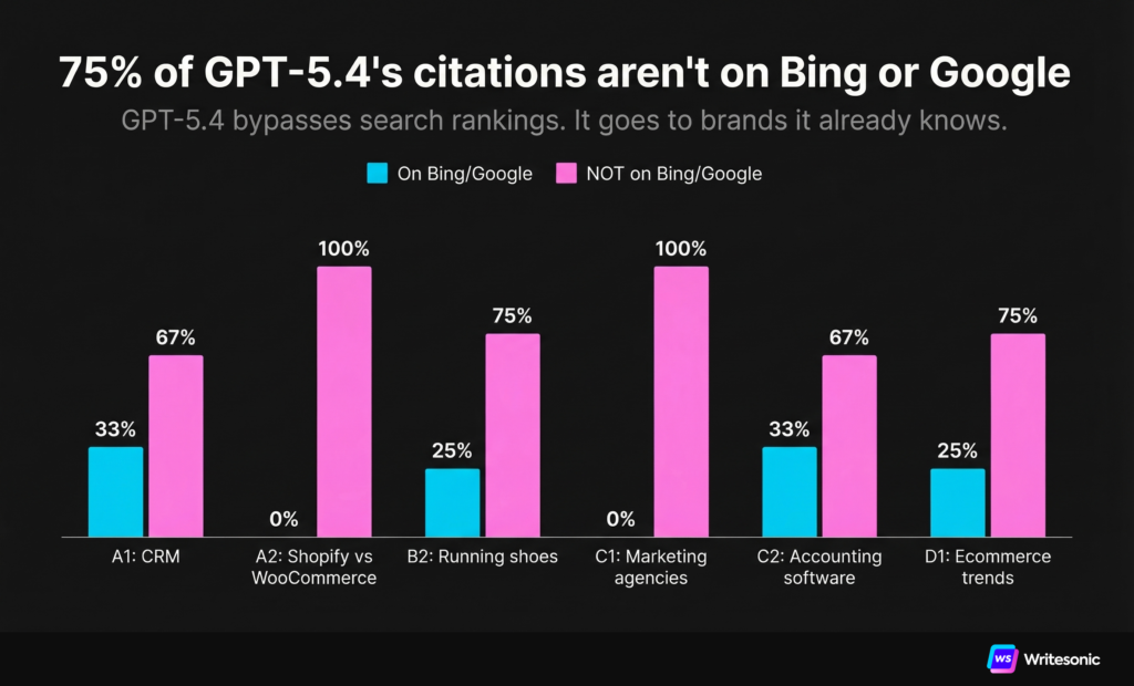 3. Search rankings alone don't predict AI visibility. 44% of GPT-5.3's citations come from domains not on Google or Bing. For GPT-5.4, that number is 75%.