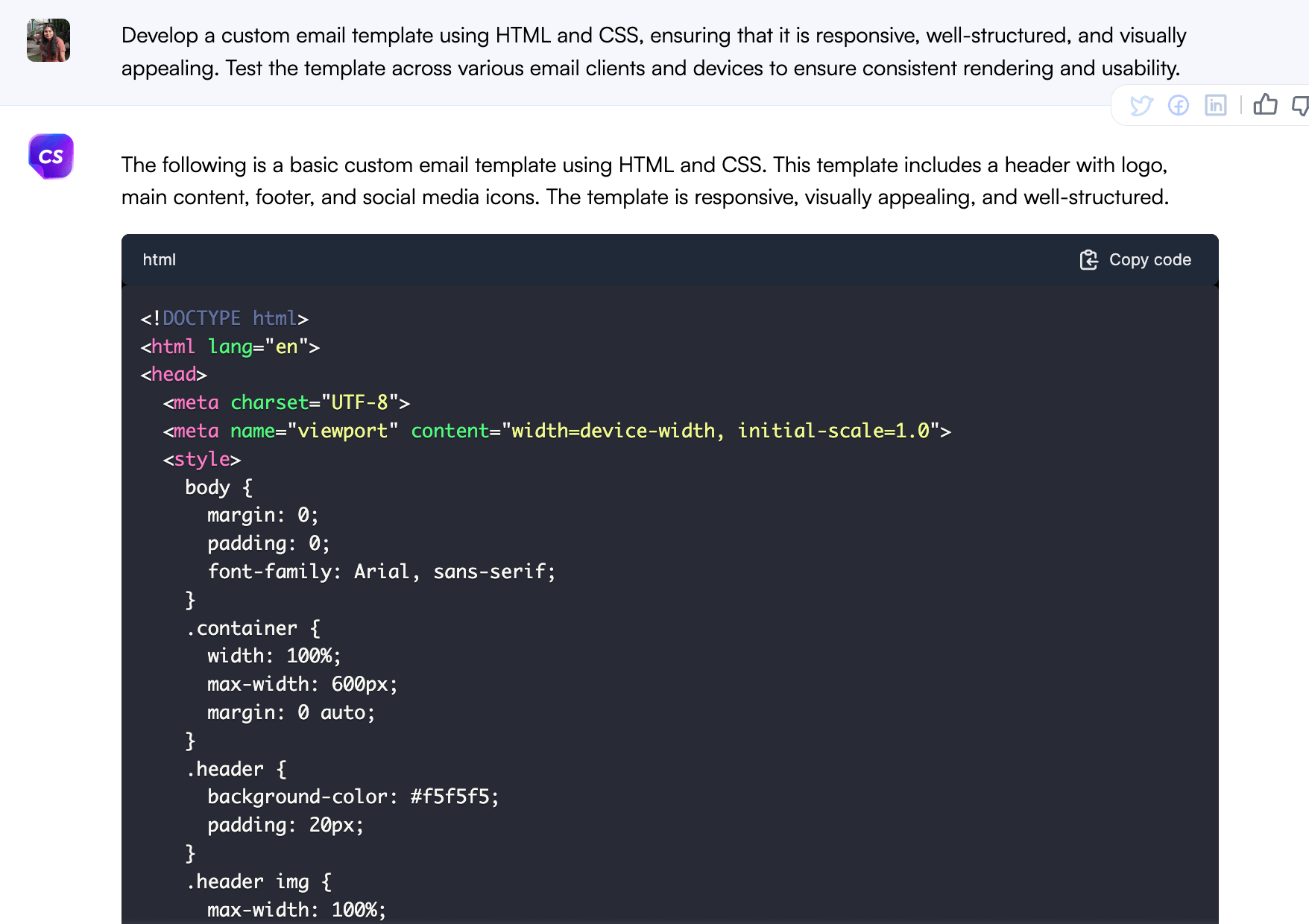 Chatsonic prompt: Develop a custom email template using HTML and CSS, ensuring that it is responsive, well-structured, and visually appealing. Test the template across various email clients and devices to ensure consistent rendering and usability.