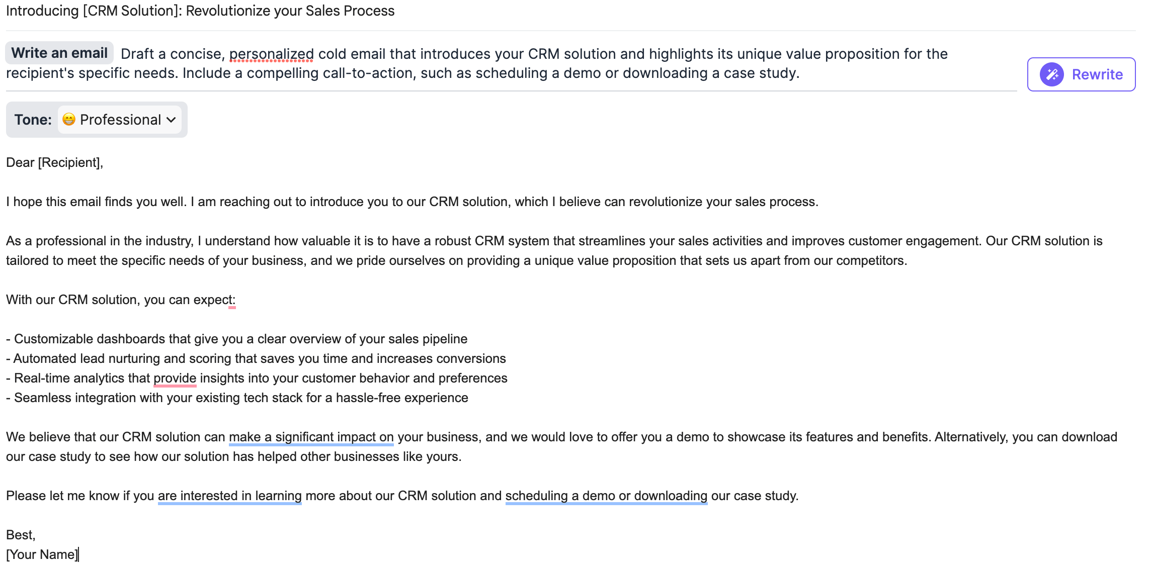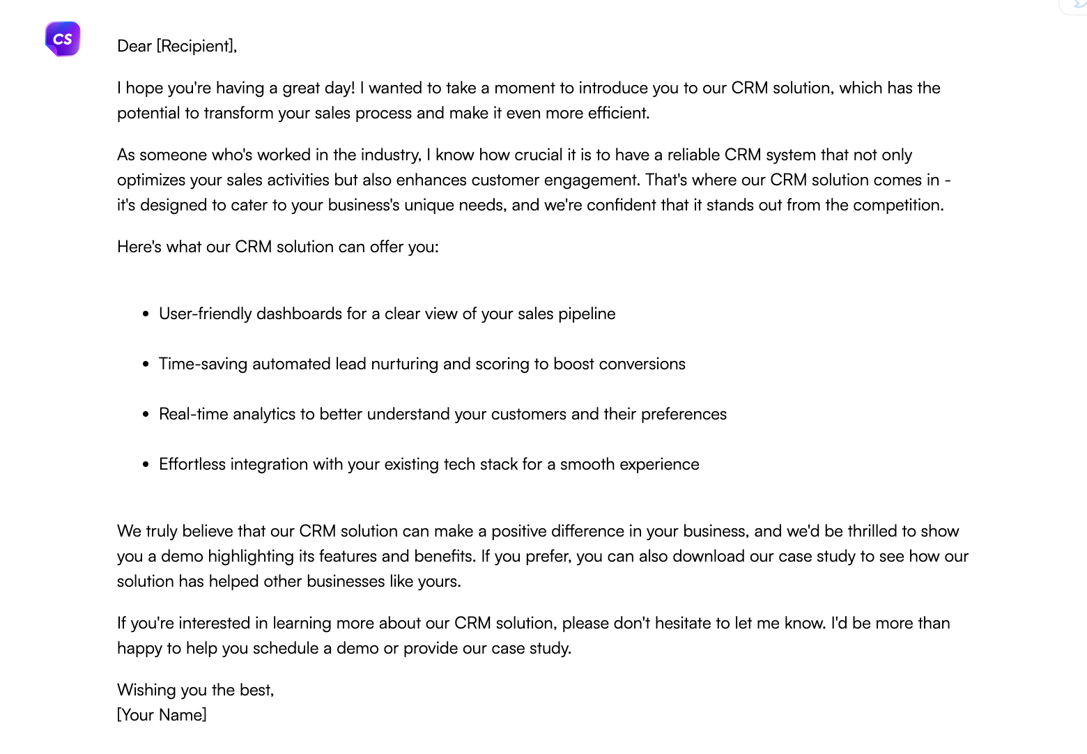 Chatsonic prompt: Draft a concise, personalized cold email that introduces your CRM solution and highlights its unique value proposition for the recipient’s specific needs. Include a compelling call to action, such as scheduling a demo or downloading a case study.