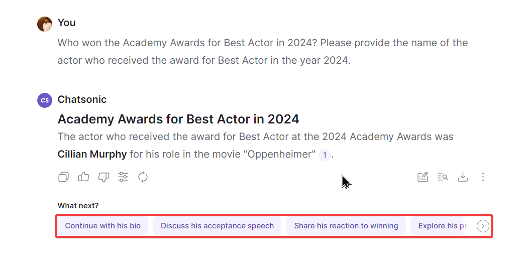 Though it might be bothersome with ChatGPT, Chatsonic saves you here. The Chatsonic AI assistant features several follow-up question suggestions after every response. You can use these questions to get useful responses from Chatsonic without beating your head!