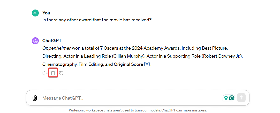 - Copy the response: Want to use ChatGPT’s response? Simply copy the response and paste it into your document. Click the Clipboard icon; once you copy it, the icon will turn into a check mark.
