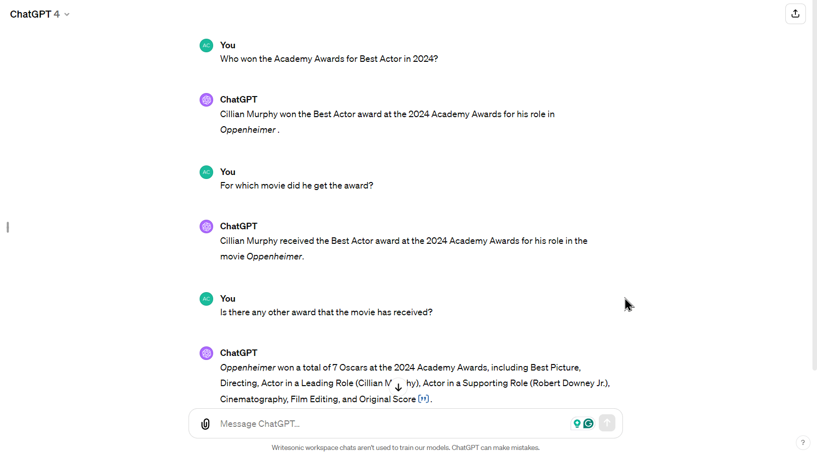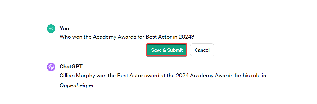 As you put your first prompt on ChatGPT, it will come up with a response in seconds. For example, here is what ChatGPT replied to the prompt “Who won the Academy Awards for Best Actor in 2024?”
