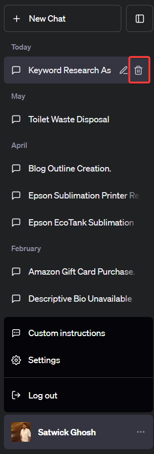 - Deleting chats: Click the trash can icon next to the chat title to delete individual chats.