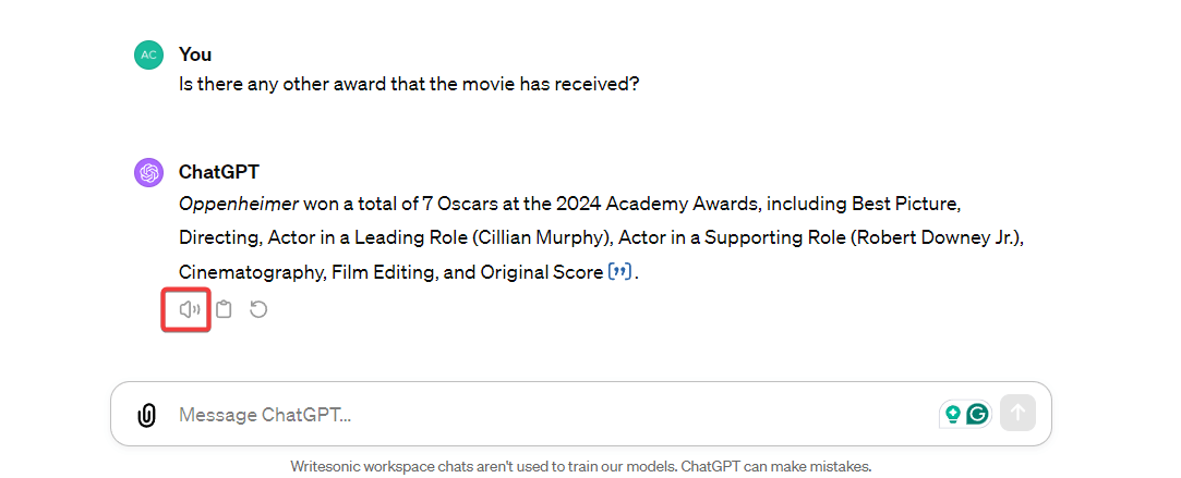 - Listen to the response: Other than reading, you can listen to ChatGPT’s output. This is especially useful when handling a long response. Click the Speaker button, and ChatGPT will start reading the response.