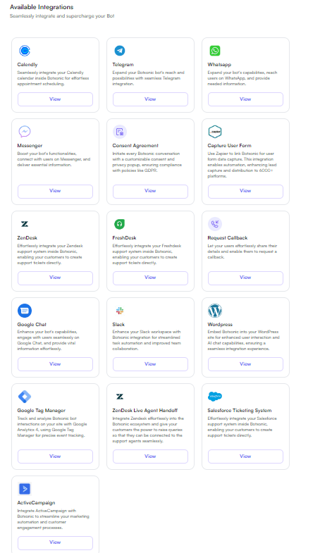 For example, Botsonic offers all the integrations you need. You can connect the chatbot with WordPress, ZenDesk, and FreshDesk. Not only that, but you can also integrate the chatbot with Facebook Messenger and WhatsApp and make it function as a WhatsApp chatbot and Messanger bot.