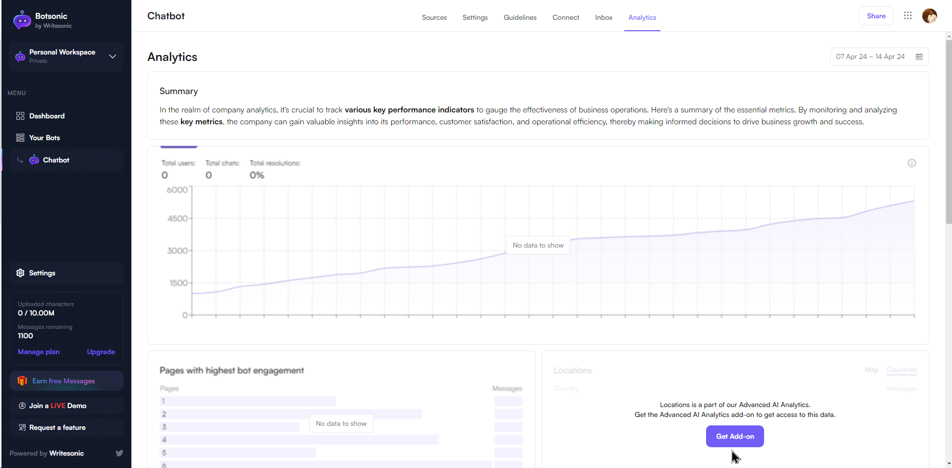 For example, Botsonic offers analytics on customer interaction. The analytics dashboard provides details on everything from the number of resolutions the bot has offered to the pages with the highest engagement. Having these details, you can understand and improve customer engagement by refining your lead bot further.