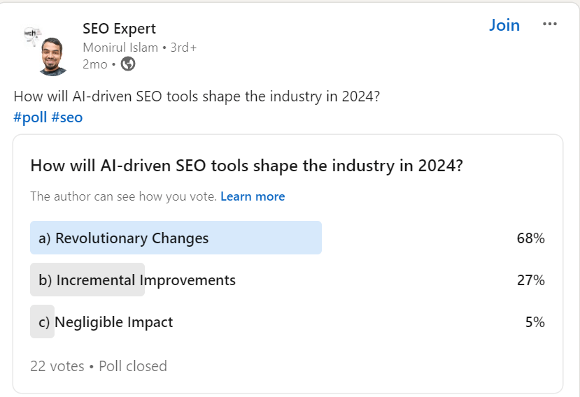 Infact, a poll by Monirul Islam an advanced SEO expert, showed that AI driven SEO tools are already revolutionizing the SEO industry.