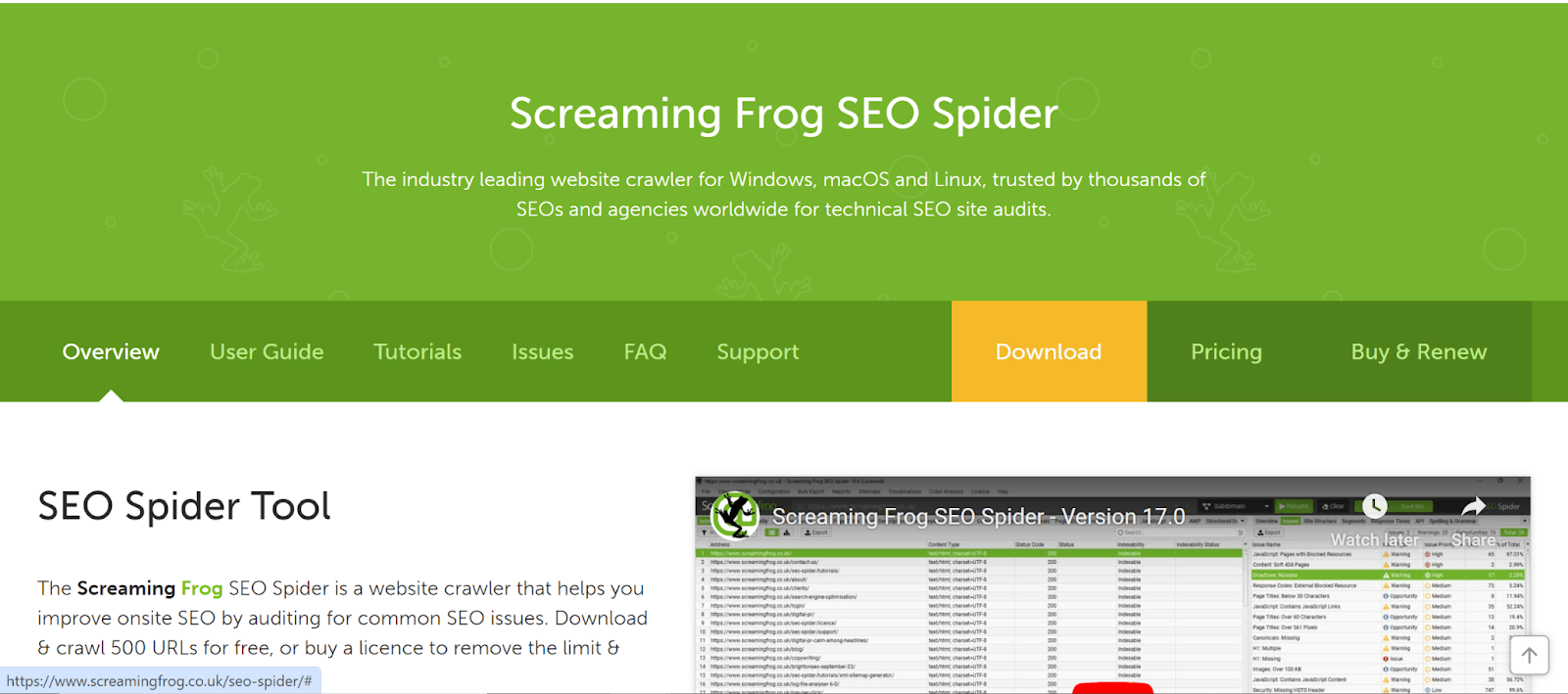 Screaming Frog is an SEO software solution that crawls your site and checks for any issues that hinder its optimization.