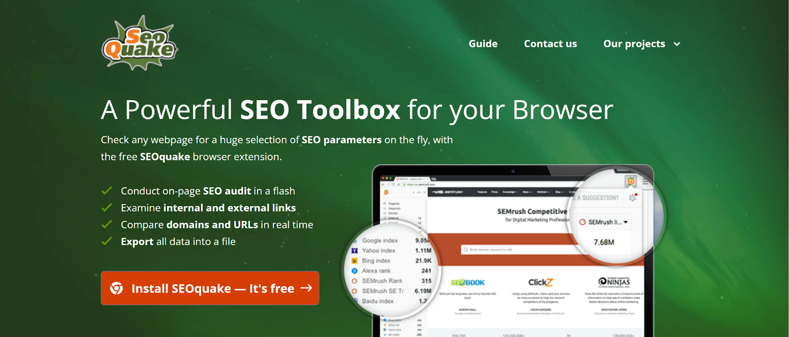 SEOquake is a widely used browser extension that provides various SEO metrics for websites: SEO Audit, internal/ external link analysis, keyword analysis and more. With this tool, you can perform your off-page SEO tasks with ease.