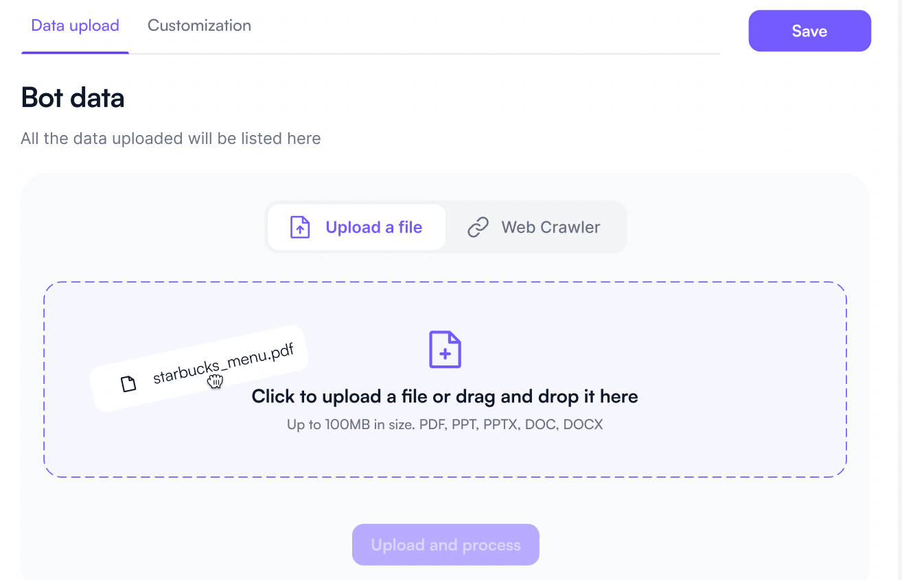 Upload your own data to Botsonic, like your company’s guidelines, refund procedures, terms & conditions, etc., in formats such as PDF, PPT, PPTX, DOC, and DOCX to ensure the AI is familiar with your knowledge base.