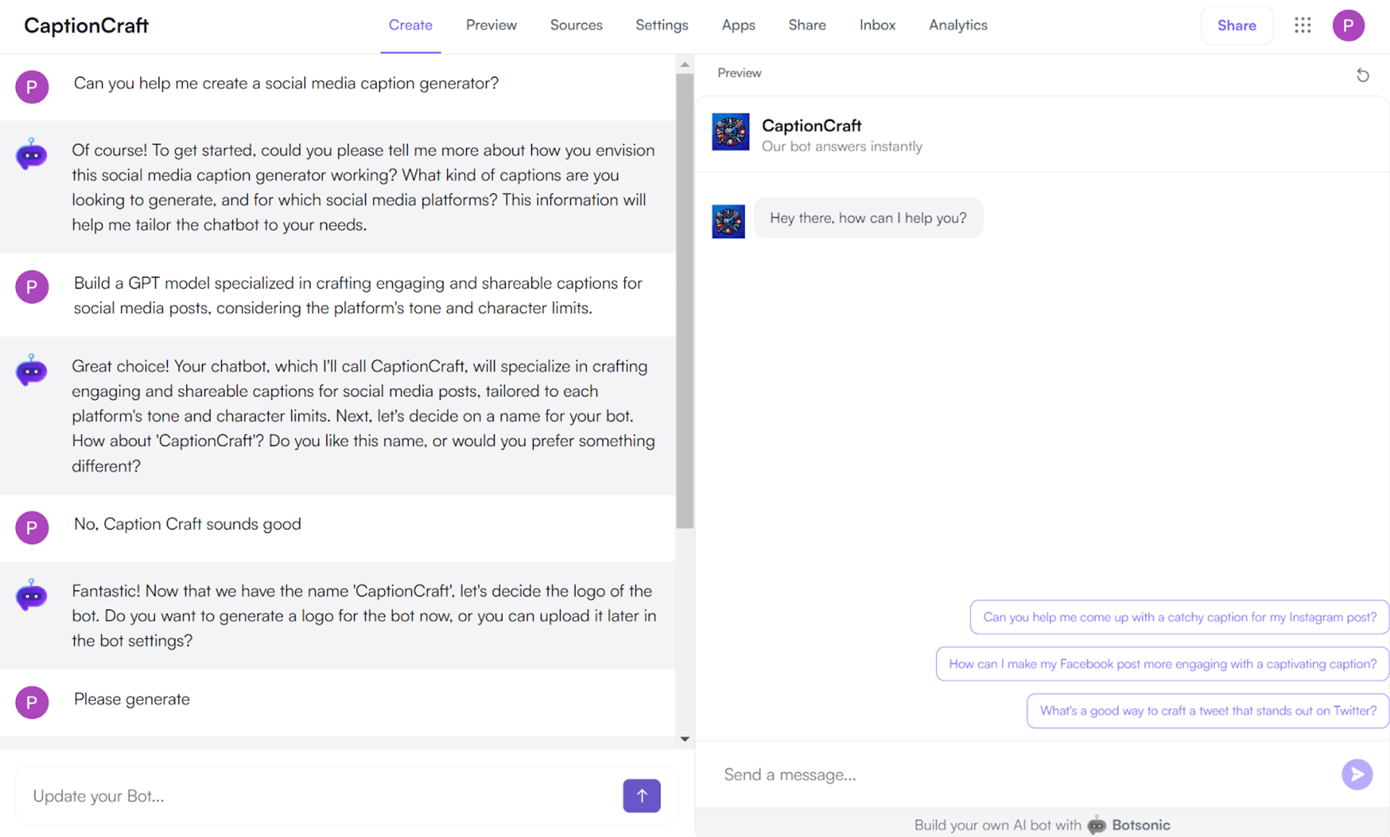 Once you start creating your bot, you can talk to the GPT bot builder to create a bot exactly how you like it